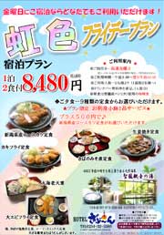 ・貸切風呂1時間無料(ご予約の際にお申し出ください。)※先着順 ・女性の方は色浴衣のサービス。・ホテルフロントにてシャンプーバイキングがご利用いただけます ・次回ご利用頂ける500円宿泊券付き など。